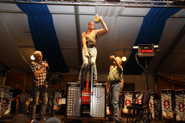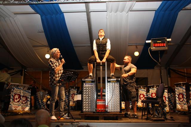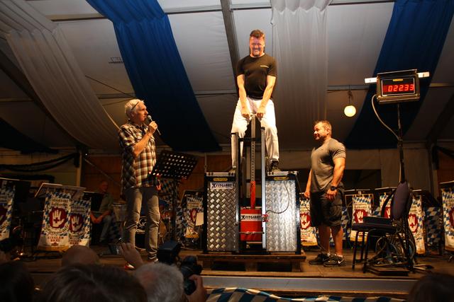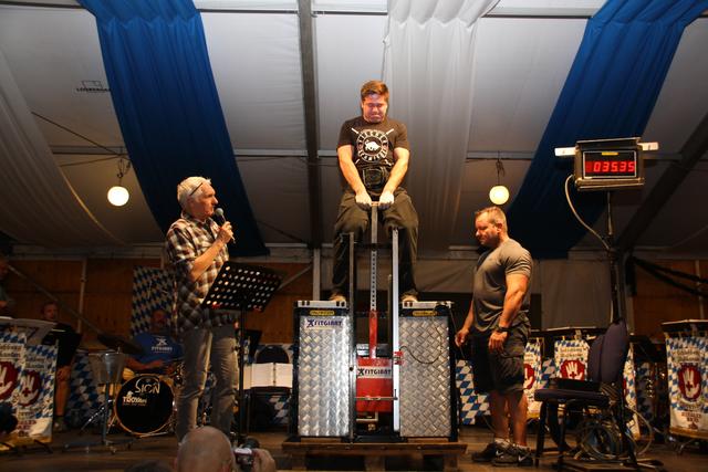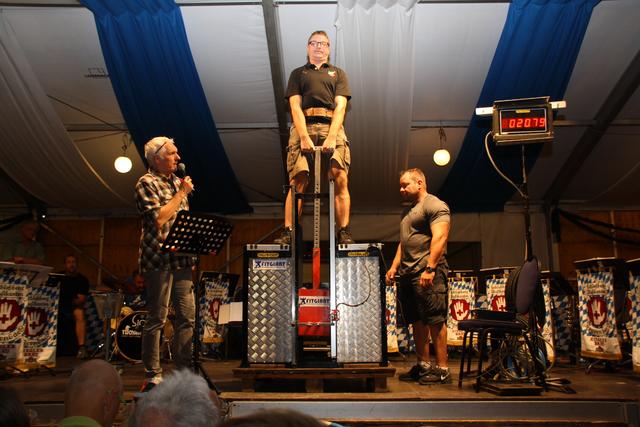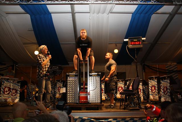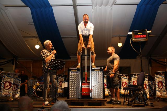 Die Messlatte für die Männer, die mit 254 kg starteten, lag also dementsprechend hoch. Bei ihnen wurde in zwei Kategorien unterschieden: Leicht- und Schwergewicht. Wie schwer 254 kg tatsächlich sind, wurde vielen jetzt erst richtig bewusst. Nicht jedem gelang es das Gewicht zu bewegen, doch es zählt ja, wie Moderator Balzer betonte, vor allem der Mut sich für diesen Kraftakt auf die Bühne zu trauen. An Zuspruch fehlte es den Kandidaten jedenfalls nicht: Für jeden einzelnen gab es Applaus und Zurufe á la „Ziag o! Ziag o jetzat!“ Letztendlich konnte sich Hans Kammerer im Leichtgewicht durchsetzen. Der Landwirt, der das Turnier von 2001 bis 2009 neun Mal in Folge gewonnen hatte, lupfte das Gewicht auf 43,96 cm und konnte dabei sogar noch einen Schluck aus der ihm gereichten Maß genießen. Auf Platz zwei lupfte sich Simon Bayerl, der zuvor schon seine Schwester angefeuert hatte, mit 42,28 cm. Den dritten Platz erreichte Karsten Müller aus Garmisch-Partenkirchen.