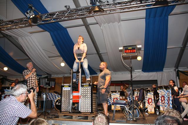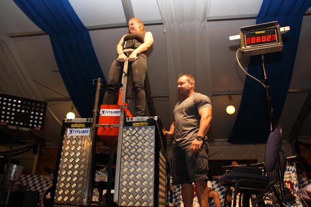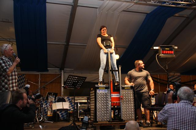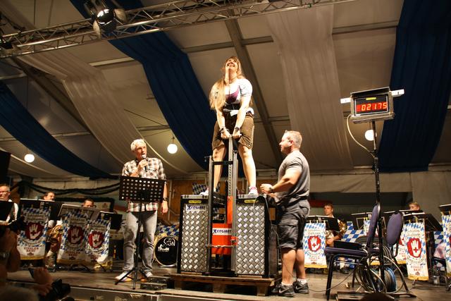 Ladies first: Den Anfang machten die Damen. Sie starteten mit einem Gewicht von 100 kg. Während Mona Englisch und Maxi Lauterbach zum ersten Mal teilnahen, war Anja Gollnhofer bereits vor 16 Jahren dabei. Auch Franziska Bayerl aus Durchschlacht kennt sich im Steinheben schon aus, nahm sie doch schon zum vierten Mal teil. Die letzte Kandidatin hatte es allerdings in sich. Nachdem Moderator Roland Balzer einige ihrer errungenen Titel aufgezählt hatte fügte er hinzu: „Und Weltmeisterin im Steinheben ist sie auch noch: Uli Ertl!“ Diese hob die 100 kg ohne große Mühe aus. Bei den Damen bedeutet das im Klartext: Sie hob das Gewicht über 80 cm hoch. Der Beifall war natürlich dementsprechend groß. Im zweiten Durchgang gelang es dann auch Franziska Bayerl das Gewicht auszuheben und so erhöhten die beiden Finalistinnen auf 125 kg. Auch hier hatte Ertl die Nase vorne, doch Bayerl erreichte mit 44,12 cm eine durchaus beachtliche Höhe. Als Schmankerl für das Publikum erklärte sich Ertl bereit das Gewicht weiter zu erhöhen. Staunend konnten die Zuschauer beobachten, wie sie sowohl 150 kg als auch 175 kg aushob. Sogar 200 kg lupfte Ertl auf 60,16 cm und siegte somit eindeutig.