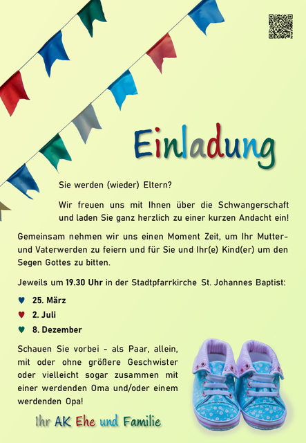 Gemeinsam mit Pfarrer Albert L. Miorin laden wir alle ganz herzlich ein, die in den nächsten Monaten (wieder) Eltern werden, vorbeizukommen. Zusammen feiern wir in einer kurzen Andacht Ihr Mutter- und Vaterwerden und bitten für Sie und Ihr(e) Kind(er) um den Segen Gottes.