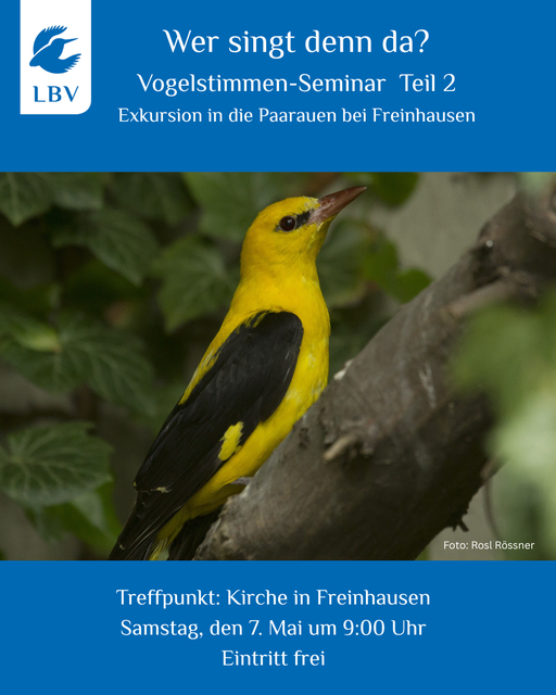 Im Frühling erklingen die vielfältigen Gesänge unserer heimischen Singvögel. Doch welcher Vogel singt eigentlich wie, und wie kann man Vögel am Gesang erkennen? Mit diesen Fragen befasst sich das zweiteilige Vogelstimmenseminar des Landesbundes für Vogelschutz (LBV) Pfaffenhofen. In einem theoretischen und einem praktischen Teil können sich interessierte Vogelfreunde an das Bestimmen von Vogelgesängen heranarbeiten. In teil 2 unseres Seminars kann man sein theoretisch erworbenes Wissen gleich in der Praxis anwenden. Der LBV lädt am Samstag, den 9. Mai ab 09:00 Uhr zu einer Vogelstimmenexkursion in die Paarauen bei Freinhausen ein. Beim gemeinsamen Spaziergang durch das Auengebiet können die dort singenden Vögel mit Unterstützung durch die Fachleute des LBV identifiziert werden. Treffpunkt für diese Veranstaltung ist an der Kirche in Freinhausen.