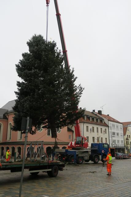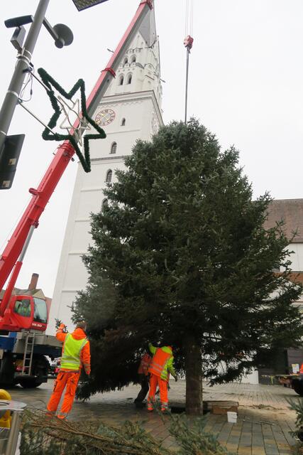 In diesem Jahr hat die Familie Steiger aus Pfaffenhofen den Baum gespendet. Mitarbeiter der Stadtwerke haben den 3,5 Tonnen schweren Baum am Morgen mit einem Traktor abgeholt und zum Oberen Hauptplatz transportiert. Dank des großen Autokrans, den die Firma Fasold aus Waidhofen der Stadt Pfaffenofen seit Jahren kostenlos zur Verfügung stellt, war der Christbaum in rund vier Stunden aufgestellt.