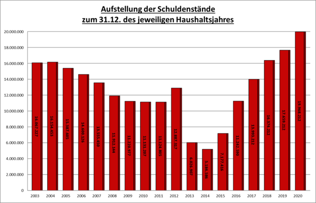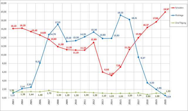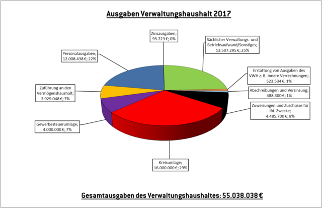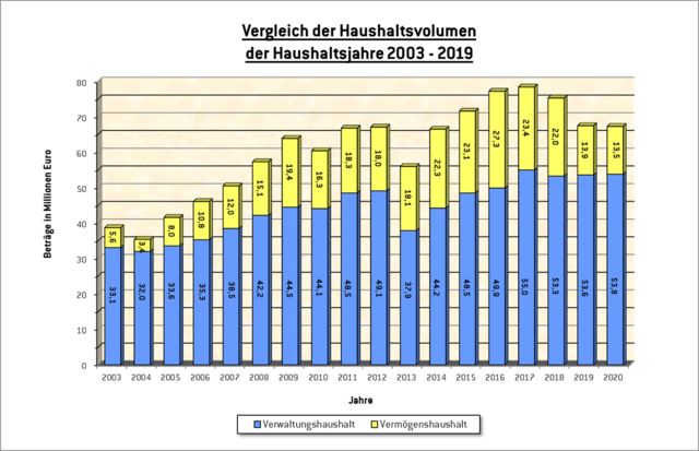 Der Gesamthaushalt 2017 schließt in Einnahmen und Ausgaben mit 78,4 Mio. Euro ab. Davon entfallen rund 55 Mio. auf den Verwaltungshaushalt und über 23 Mio. auf den Vermögenshaushalt. Kreditaufnahmen sind nicht eingeplant, aber aus der allgemeinen Rücklage werden knapp 8,8 Mio. Euro entnommen. Bis Ende 2017 verbleiben noch rund 9,5 Mio. Euro in der Rücklage, die dann in den Finanzplanungsjahren 2018 bis 2020 kontinuierlich abgebaut wird. Der Schuldenstand liegt zum Jahresende 2017 bei knapp 14 Mio. Euro und wird bis 2020 voraussichtlich auf den Höchststand von 19,97 Mio. Euro steigen.