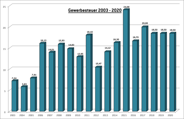 Die Steuerhebesätze bleiben aktuell unverändert, die Grundsteuer A bei 350 v. H., die Grundsteuer B bei 380 v. H. und die Gewerbesteuer bei 345 v. H.