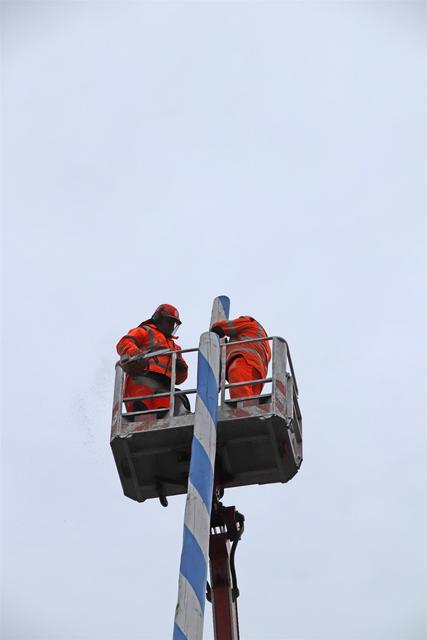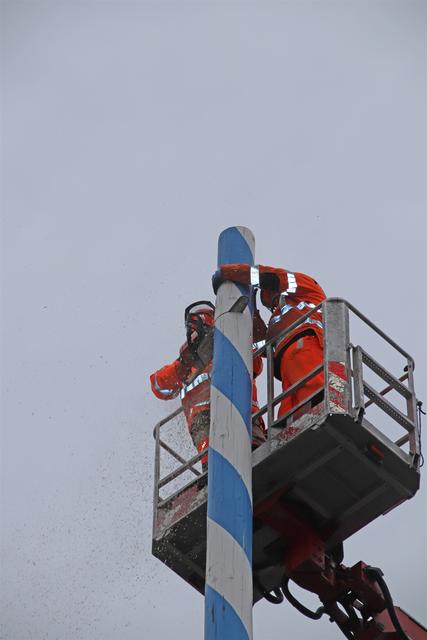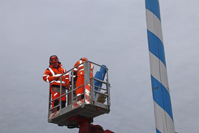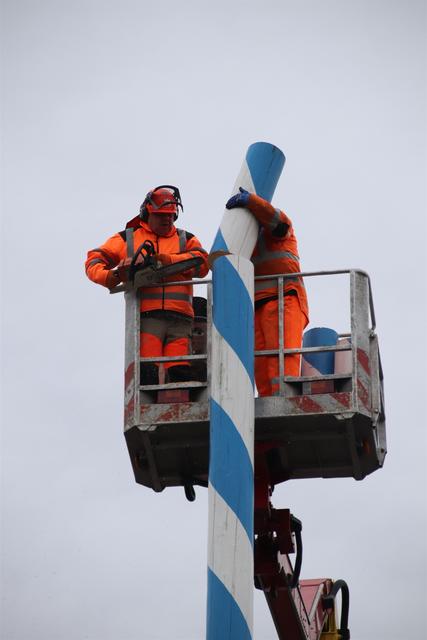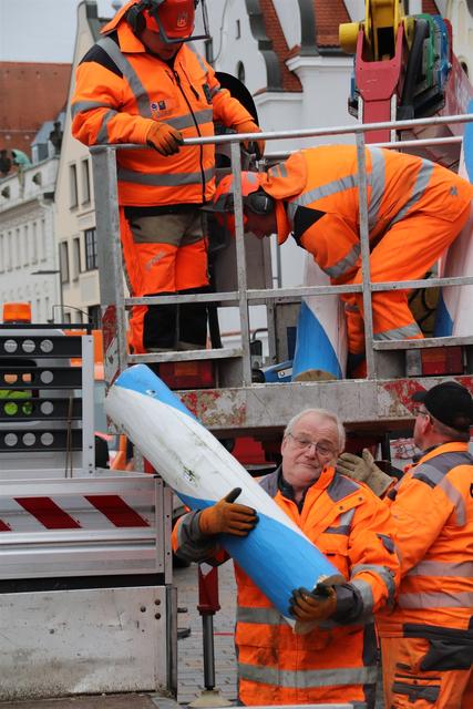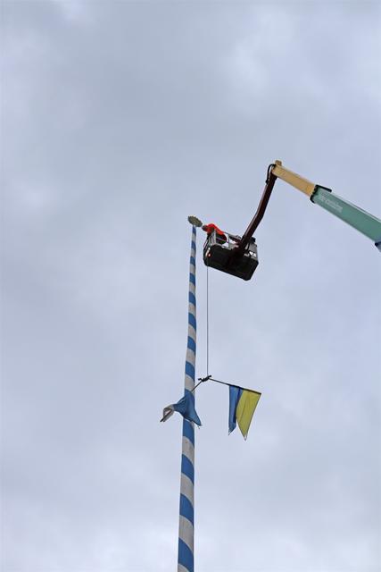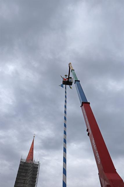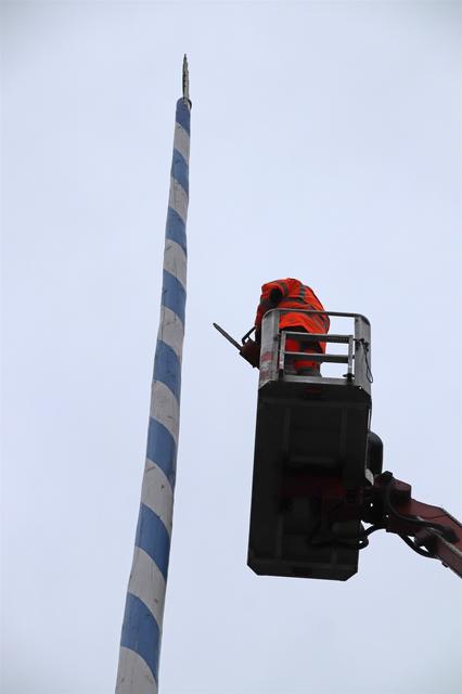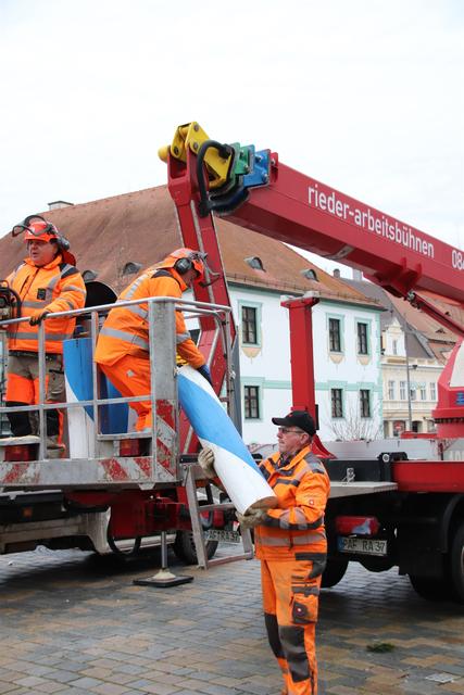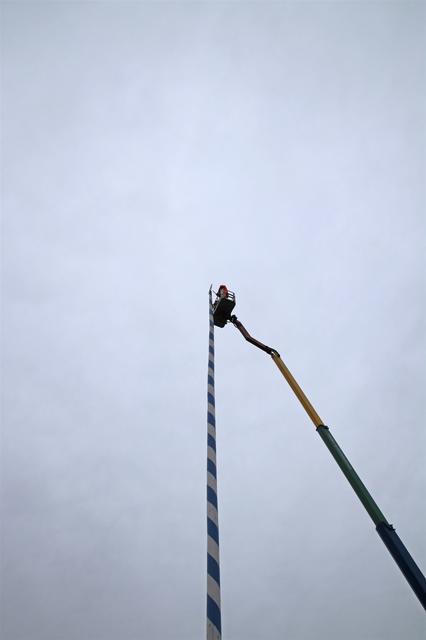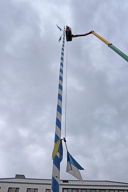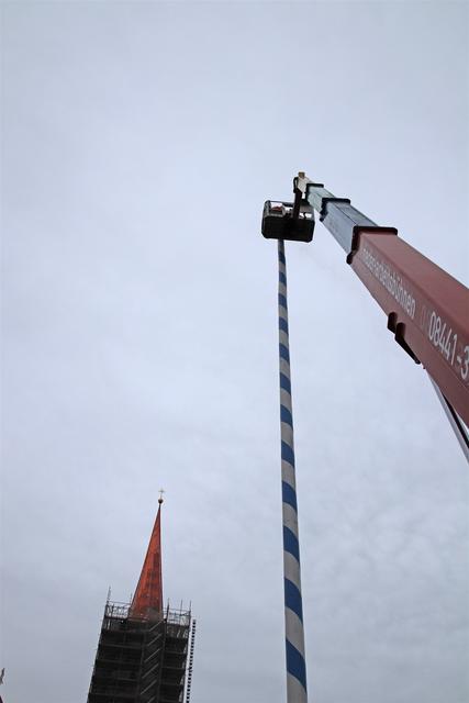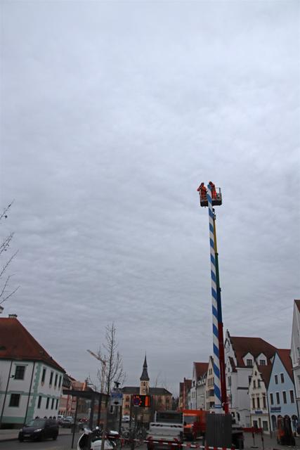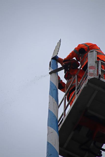 Mitarbeiter des Kommunalunternehmens Stadtwerke Pfaffenhofen haben am Mittwochnachmittag den Maibaum auf dem Hauptplatz zerlegt und abtransportiert. In 26 Metern Höhe schnitten die Arbeiter zuerst die Spitze ab und zersägten den Baum dann in handliche Stücke. Der Maibaum hat drei Jahre lang auf dem Hauptplatz gestanden. Zum 1. Mai wird die Stadt einen neuen Maibaum aufstellen, der in den nächsten Monaten vorbereitet wird.