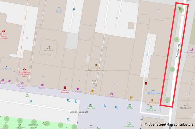 Auch in der Frauenstraße gegenüber den Hausnummern 12 bis 26 finden Baumpflegearbeiten statt. Hier entfallen während der Arbeiten die Parkplätze und der Fußweg.