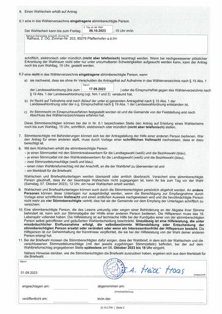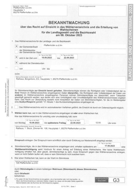 Öffentliche Bekanntmachung über das Recht auf Einsicht in das Wählerverzeichnis und die Erteilung von Wahlscheinen für die Landtagswahl und die Bezirkswahl am 08. Oktober 2023: