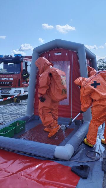 Für die CSA-Träger bestand die Übung aus insgesamt drei Stationen. Nach dem Ausrüsten der CSA - Träger ging es für diese zuerst zu einer Erkundungsübung. Im Fokus stand hierbei das Erkennen und Übermitteln von gefährlichen Stoffen. An der zweiten Station musste eine Leckage mit bereitgestellten Materialien abgedichtet werden. Anschließend ging es für die CSA-Träger zur dritten Station, der Dekontamination. An dieser Station erfolge das Reinigen und Entkleiden der Träger. (FS)