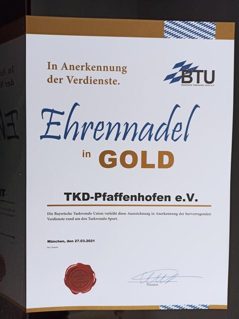Für hervorragende Verdienste rund um den Taekwondo Sport, wurde der Taekwondo 1995 Pfaffenhofen e.V. mit der goldenen Ehrennadel ausgezeichnet. In Vertretung der BTU (Bayerische Taekwondo Union) durfte der sportliche Leiter vom TKD 1995 Walter Schichtl die Urkunde überreichen. Wegen der aktuellen Beschränkungen überreichte Walter die Auszeichnung im kleinsten Kreis an den ersten Vorstand des TKD 1995 Paul Kreuzer.