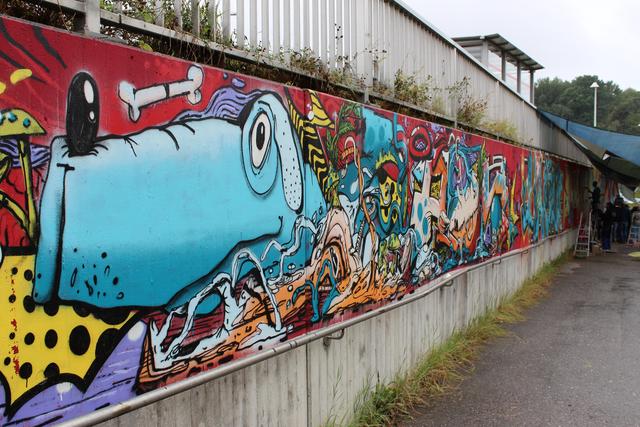 Die Graffiti-Künstler waren zum Teil weitgereist: Aus Südfrankreich, aus Paris, aus Montreal, aus London, aus Innsbruck und Wiesbaden kamen sie nach Pfaffenhofen auf Einladung der städtischen Kulturabteilung und der Stadtjugendpflege, um gemeinsam die Fläche von über 300 Quadratmetern zu gestalten. Aber auch die lokalen Sprüher waren mit von der Partie und konnten sich auf eigenen Flächen einbringen.