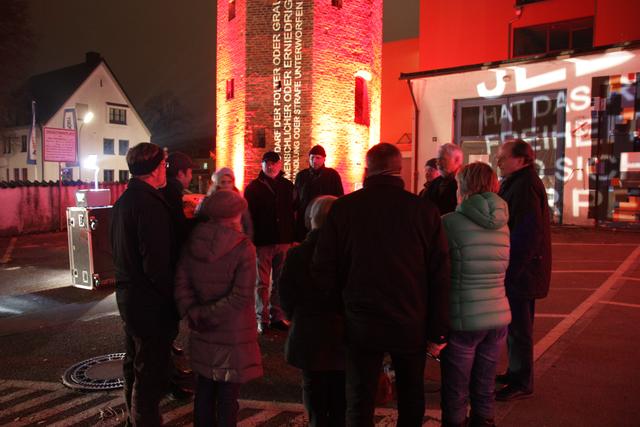 Am Sonntagabend liefen viele Passanten auf ihrem Weg zum Christkindlmarkt mit in den Nacken gelegtem Kopf am illuminierten Hungerturm vorbei. Dieser sowie die Alte Kämmerei wurden in Rot und mit den Artikeln 3 und 5 der Allgemeinen Menschenrechtserklärung beleuchtet, welche das Fundament der Argumentation gegen die Todesstrafe darstellen. Damit sollte auf den Aktionstag „Städte für das Leben – gegen die Todesstrafe“ aufmerksam gemacht werden. Dieser Tag ist die weitest reichende internationale Kampagne mit dem Ziel, die Todesstrafe weltweit abzuschaffen und den Wert des Lebens ohne Ausnahme zu betonen.
