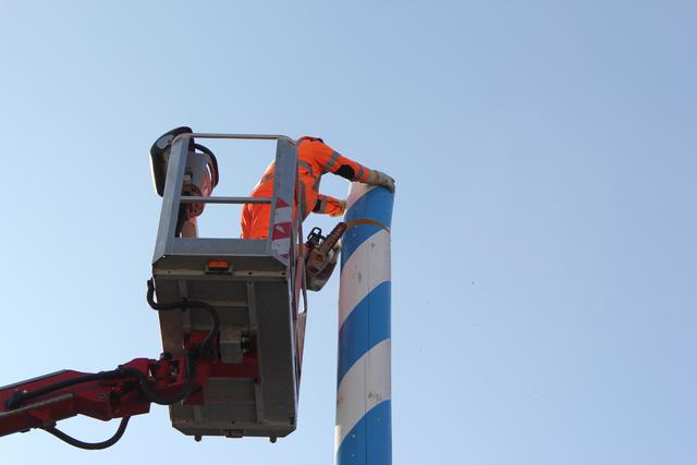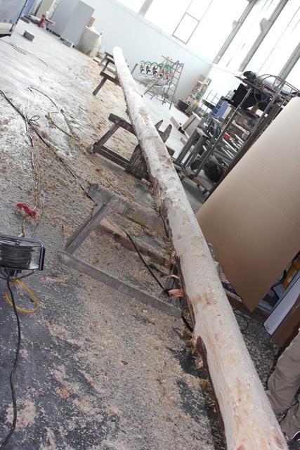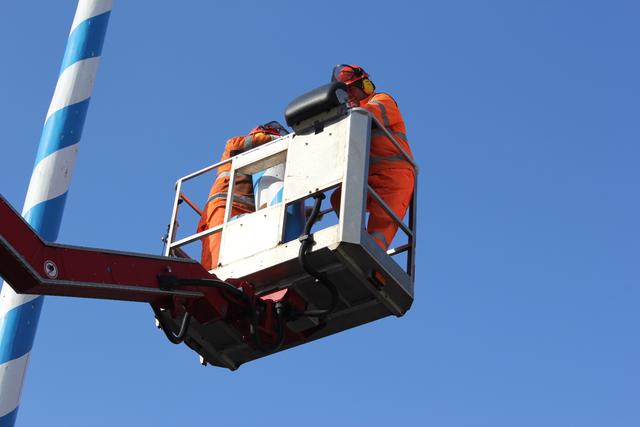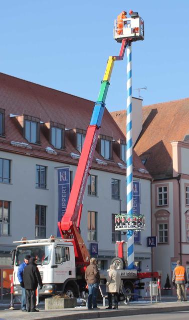 Nachdem der drei Jahre alte Maibaum letzten Monat am Oberen Hauptplatz durch den Bauhof abgesägt wurde, wartet die neue 27 Meter lange Fichte aus dem Stadtwald nun auf ihren weiß-blauen Anstrich. Die Mitarbeiter des Bauhofes können dann im Anschluss die traditionellen Tafeln und Figuren anbringen.