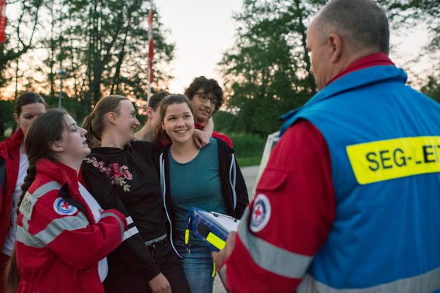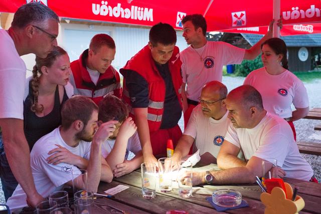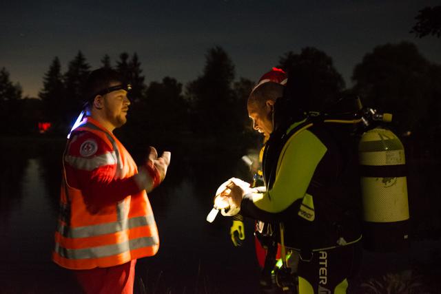 Bei Dämmerungseinbruch wies Thomas Roth als Übungsleiter die Jugendlichen der Wasserwacht in die Übung ein. Dazu versenkte er im Vorfeld mehrere Übungspuppen in einem Weiher, um die Suchaktion so realistisch wie möglich zu gestalten. „Sechs Mitglieder unserer Jugend-Einsatz-Gruppe spielen betrunkene Jugendliche, von denen einige auf ihrem Rückweg nachhause oder beim Schwimmen im Weiher in Wassernot geraten sind.“, meint Thomas Roth weiter. Unterdessen koordiniert SEG-Leiter Gunther Unger die Aufgaben unter seinen Einsatzkräften: „Wir haben Sanitäter, Wasserretter, Leinenführer und drei Rettungstaucher, von denen einer in Ausbildung ist, am Übungsort dabei. Eine gute Ortskenntnis ist dabei ebenso notwendig wie eine umfangreiche Ausbildung. Auch bei widrigen Einsatzbedingen, z.B. Dunkelheit, sollen sich die Einsatzkräfte erfolgreich zurechtfinden!“