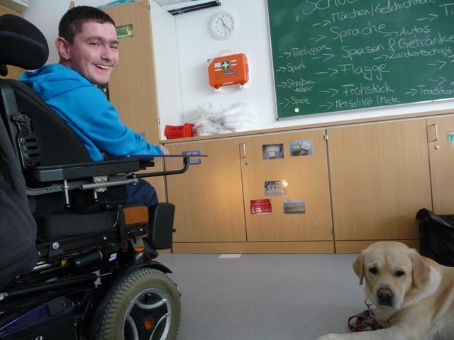 Wenn Florian aus dem Schulbus steigt, ist seine erste Frage: „Ist Odin da?“ Florian besucht die Adolf-Rebl-Schule, das Förderzentrum für geistige Entwicklung. Der Labrador „Odin“ ist der Schulhund. Er hat zusammen mit seiner Besitzerin, der heilpädagogischen Förderlehrerin Doris Schneider, eine umfangreiche Ausbildung in tiergestützter Pädagogik und Therapie absolviert. Ein Hund in der Schule schafft eine entspannte Lernatmosphäre und motiviert die Kinder in vielen Bereichen: Odin apportiert zum Beispiel Mäppchen, deren Inhalt eine Rechenaufgabe ist. Er bringt Karten, aus denen ein Wort oder Satz gebildet werden muss oder legt seine Pfote auf Punkte, unter denen Aufgaben versteckt sind. Motivierend ist es, wenn als Belohnung für eine gute Arbeit Kuscheln mit Odin winkt.