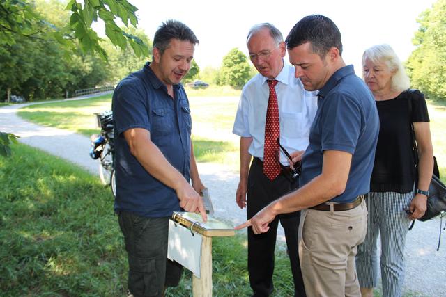 - Bei der Eröffnung des neuen Biberlehrpfads (von links): Bürgermeister Thomas Herker, die BN-Ortsvorsitzende Christine Janicher-Buska, Natur-Pädagoge Robert Beringer und Stellvertretender Landrat Anton Westner.