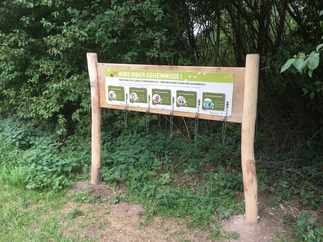 Fünf Biberstationen informieren über den „fleißigen Baumeister am Gewässer“ und da gibt es neben Texten und Fotos auch ein Stück Biberfell, einen Biberschwanz und Zähne zum Anfassen. An elf Baumstationen erhält man zudem Informationen über Baumfamilien, Blätter und Früchte. Dazu gibt es Aufgaben zum Ausprobieren und Erkunden vor Ort.