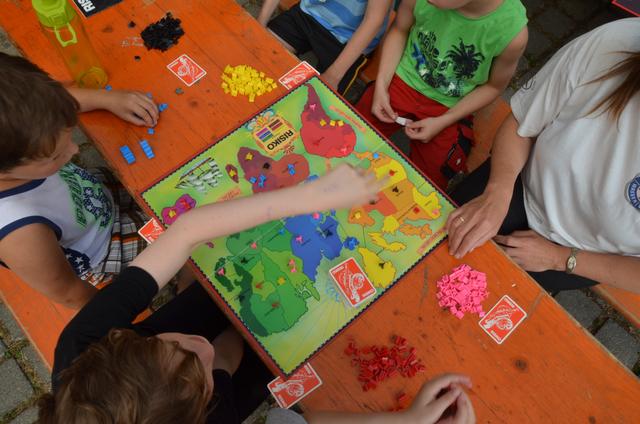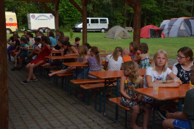 Wie im vergangenen Jahr bekochten uns die Damen von Katastrophenschutz ausgezeichnet: Von den Spaghetti und vor allem der Bolognesesoße blieb nichts übrig. Gut gestärkt konnten die Nachmittagsaktivitäten starten. Unsere Jugendleiterin Julia hatte sich ein 100 Fragen Spiel, eine Verbindung aus Brettspiel und Schnitzeljagd, ausgedacht. 4 Teams spielten gegeneinander. Zuerst würfelte jedes Team und setzten ihre Spielfigur entsprechend der gewürfelten Augenzahl auf dem Spielfeld weiter. Nun hieß es den Zettel mit der Frage entsprechend der Nummer des Spielfeldes zu finden. Diese waren zuvor im gesamten Zeltlagerbereich versteckt worden. Nach Abgabe der richtigen Antwort durfte wieder gewürfelt werden. Die Kinder waren mit vollem Einsatz dabei. Mitunter wurde es sehr laut, wenn mehrere Teams gleichzeitig ihre Antworten abgeben wollten. Zum Glück hatte Julia das Spiel auf 50 Fragen zu reduzieren.