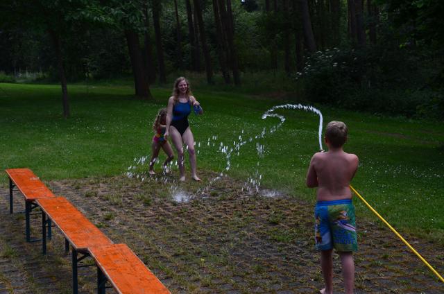 Das Wetter ließ es zu, dass die Kinder in Badekleidung Wasserschlachten ausführen konnten. Mit Bechern, Sprühflaschen und Gartenschlauch kühlten sich jung und alt ab.