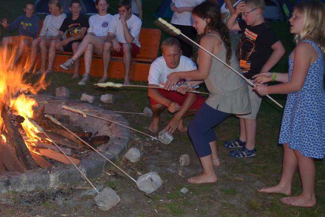 Angekommen wurden die Zelte in einem großen Halbkreis aufgebaut. Während die älteren Jugendlichen ihre Zelte selbstständig aufbauten, erhielten die jüngeren Kinder Unterstützung von ihren Eltern oder den älteren Jugendlichen. Anschließend war endlich Zeit zum Toben, bis es zum Abendessen ging. Highlight des Abends war sicher das Lagerfeuer. Beim Backen der Stockbrote konnte jeder seine eigenen Künste beweisen. So manches Brot war etwas angebrannt. Geschmeckt hat es trotzdem. Viel zu schnell ging der Abend herum und es hieß: "Ab ins Bett!"