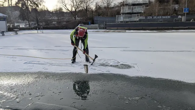 Das Schwimmvergnügen musste dieses Jahr hart erarbeitet werden. Eine massive, acht bis neun Zentimeter dicke Eisschicht bedeckte das 50-Meter-Becken des Freibads. Mit Äxten und vollem Körpereinsatz befreiten die Helfer eine 25 Meter lange Bahn von den Eisschollen, um den Schwimmern den nötigen Platz für ihre Bahnen zu schaffen.