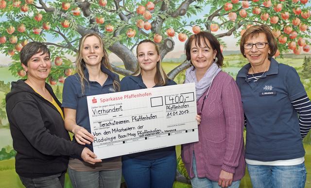 | … dann ist Scheckübergabe. Mitarbeiter des Pfaffenhofener Kompetenzzentrums für Radiologie und Nuklearmedizin Dr. Boos / Dr. Moog hatten vor Weihnachten eine Tombola organisiert. Kleine Geschenke von Pfaffenhofener Geschäftsleuten, Apothekern und Ärzten wurden nett verpackt und diese dann – bei einem günstigen Lospreis – wieder unter die Mitarbeiter gebracht. Der stolze Erlös, 400 Euro, ging an den Tierschutzverein Pfaffenhofen.