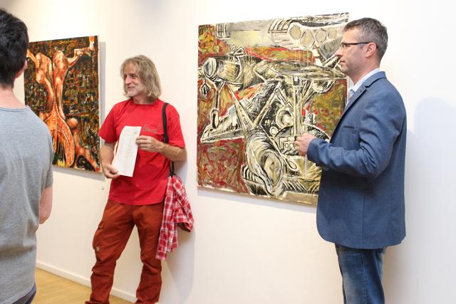 Reiner Schlamp in der Ausstellung „Aussen“ (rechts im Bild der frühere Kulturreferent Hellmuth Inderwies).